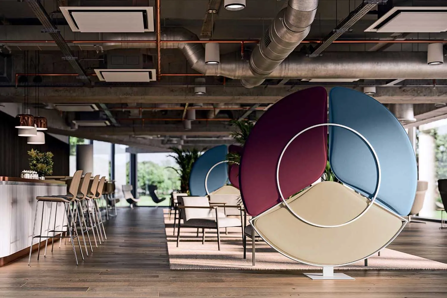 Fonction : espace collectif / espace ouvert / co-working / réunion. Chaque configuration permet de créer des micro-espaces qui favorisent la concentration sans perdre le contact avec l’environnement.