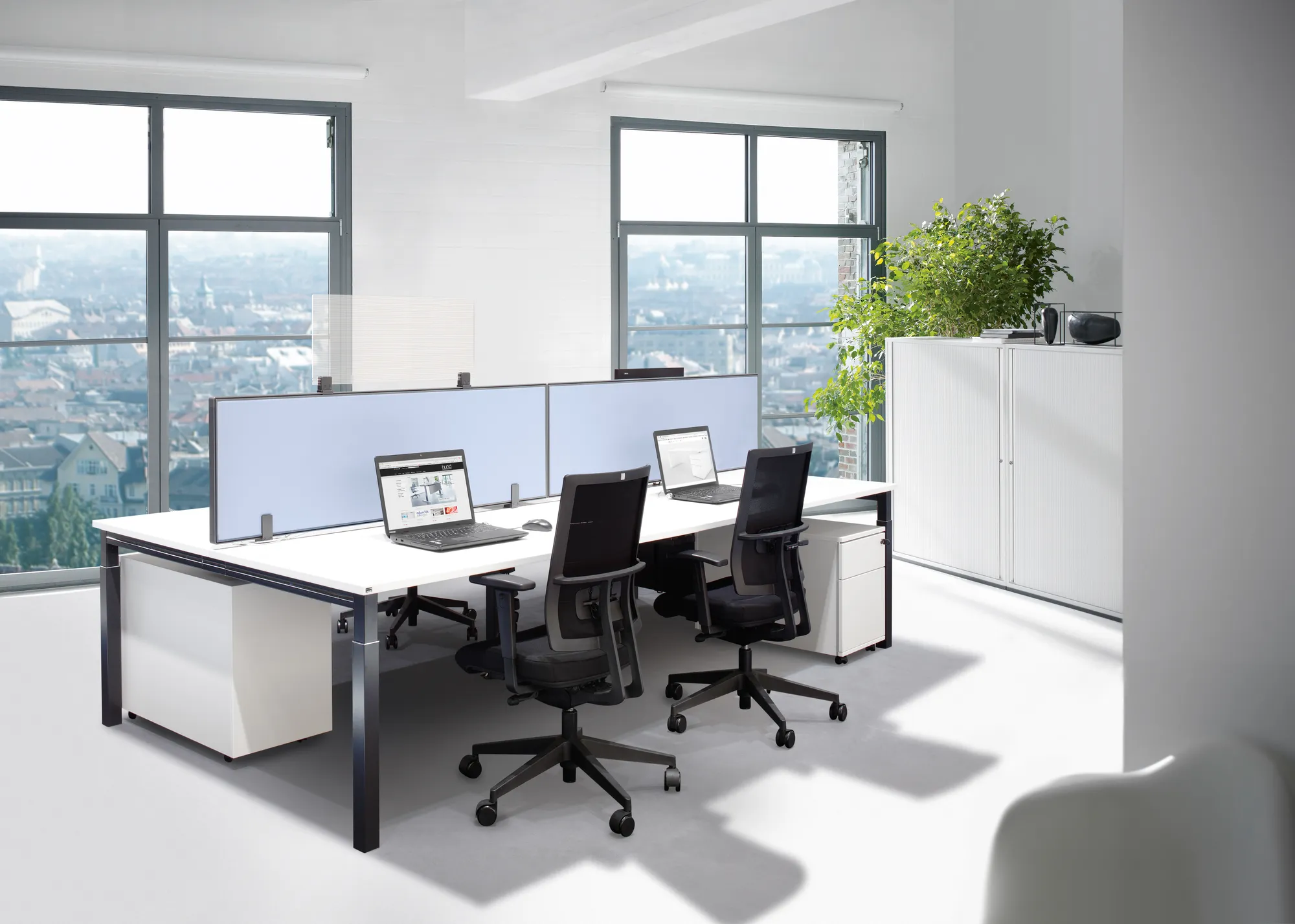 Fonction : open space / collaborateur / co-working Il s’agit de programme d’écrans fait pour protéger des postes de travail dans un sens acoustique et visuel. Mais ces panneaux aident aussi à structurer des bureaux et apporte une attribution à leur organisation.