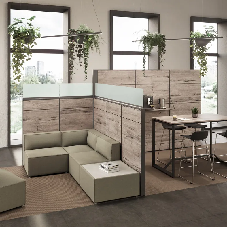 Chaque configuration permet de créer des micro-espaces qui favorisent la concentration sans perdre le contact avec l’environnement. Un design fonctionnel et polyvalent qui transforme les espaces de travail en écosystèmes équilibrés et prêts pour le quotidien.