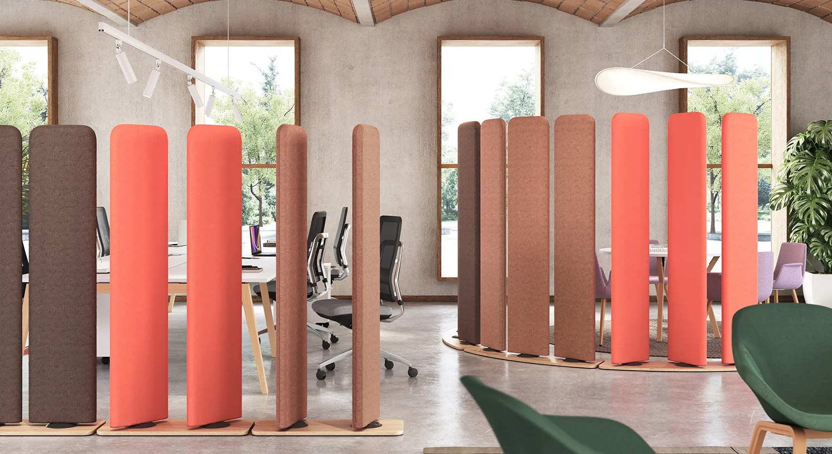 Des solutions légères, modulaires et variées, idéales pour délimiter des postes de travail, créer des espaces de concentration ou apporter une chaleur acoustique dans les espaces ouverts.