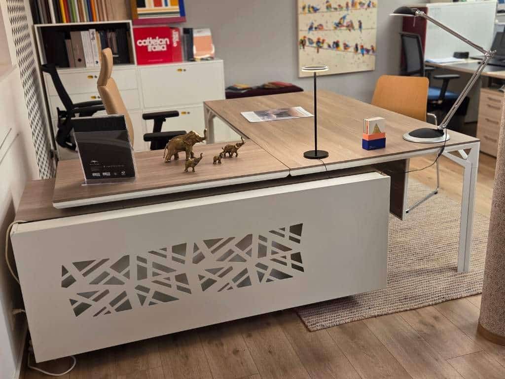 Structure métallique coloris blanc, console retour avec dos métallique coloris blanc équipé d’un top access sur le dessus et d’obturateurs sur le fond. Voile de fond L 180 cm décor orme et structure métallique coloris blanc.