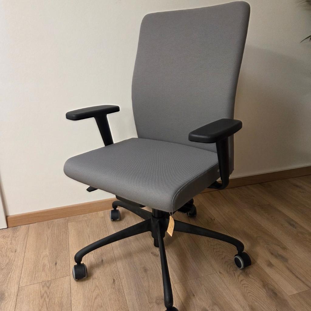Dossier moyen réglable en hauteur, accoudoirs 1D, synchrone avec 5 positions de blocage, translation d’assise, piétement nylon noir avec roulettes auto freinées. Dim. L68 X P68 X H 119-115 cm.
