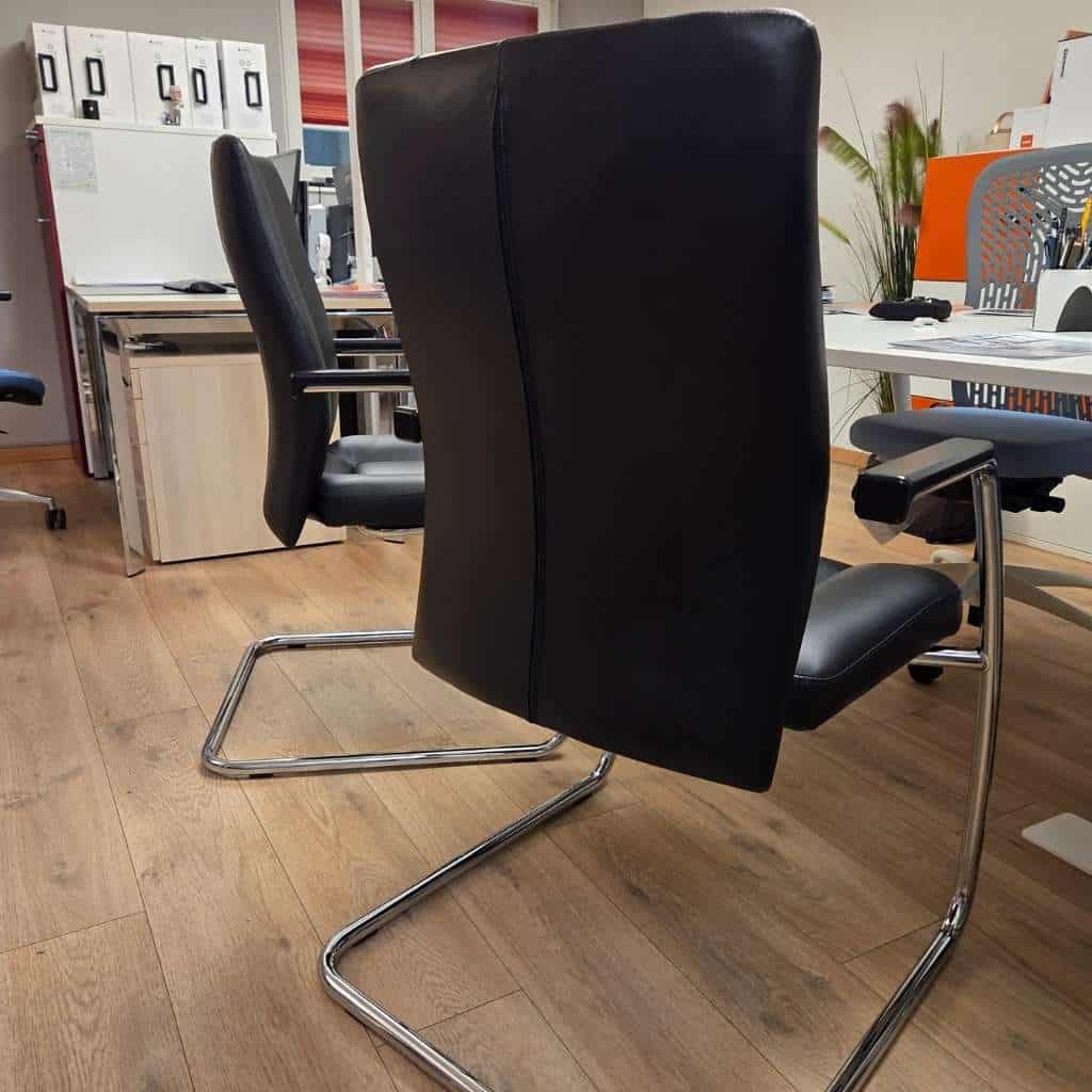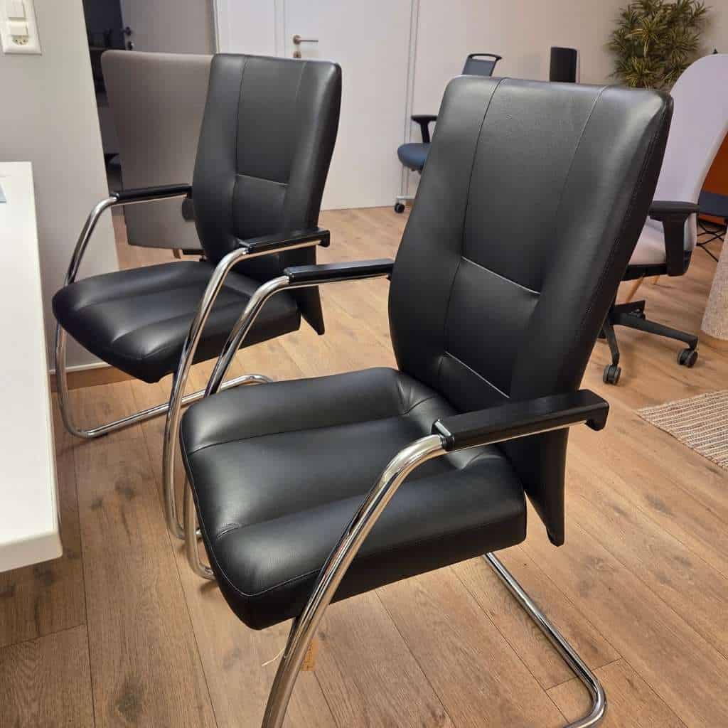 Lot de 2 fauteuils, cuir noir pleine fleur, piétement luge chromé. Manchettes bois massif teinté noir. Dim. L61 X H 103 X P 65 cm.