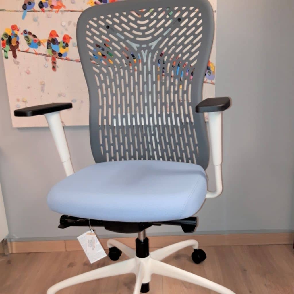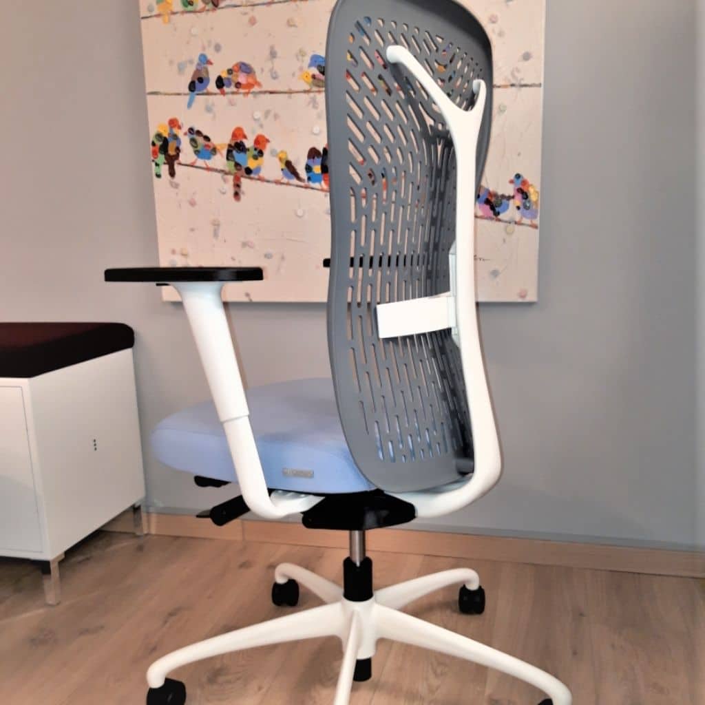 Système synchrone avec 5 positions de blocage, dossier polypro perforé flex, réglable en hauteur, translation d’assise, réglage en intensité, piétement nylon blanc, roulettes pour sol dur, accoudoirs 1D réglables en hauteur avec manchettes en PU noir et blanc.